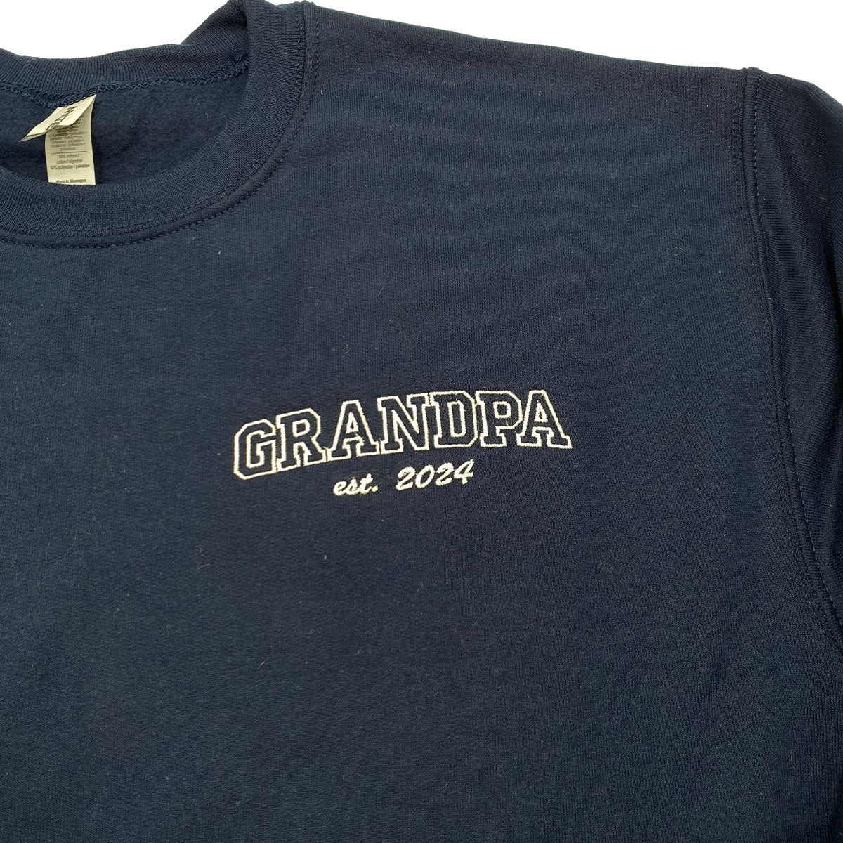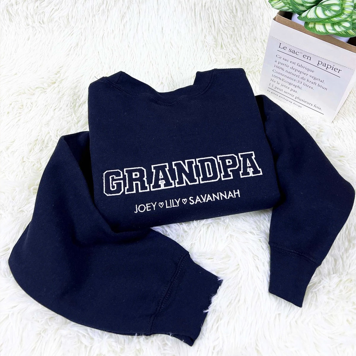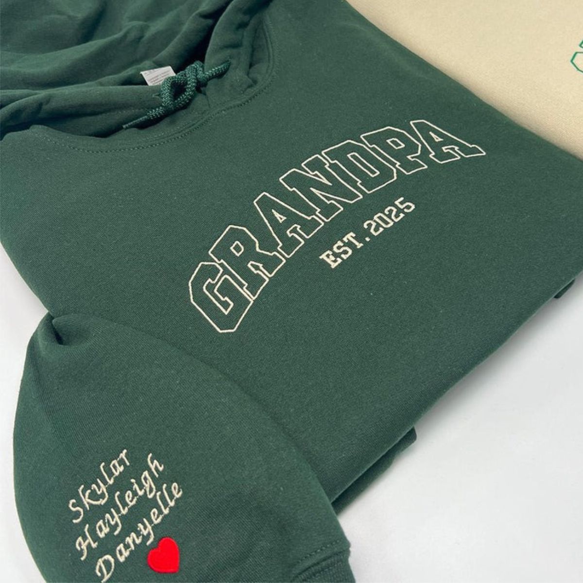 Custom embroidered grandpa sweatshirt and hoodie featuring kid names and Est years in a stylish varsity design. This personalized embroidered sweatshirt is the perfect Father’s Day gift to celebrate grandpa’s special role in the family. Made with premium, soft fabric for comfort and durability, it combines meaningful customization with classic varsity style. Order your custom grandpa sweatshirt today for a unique and cherished keepsake.